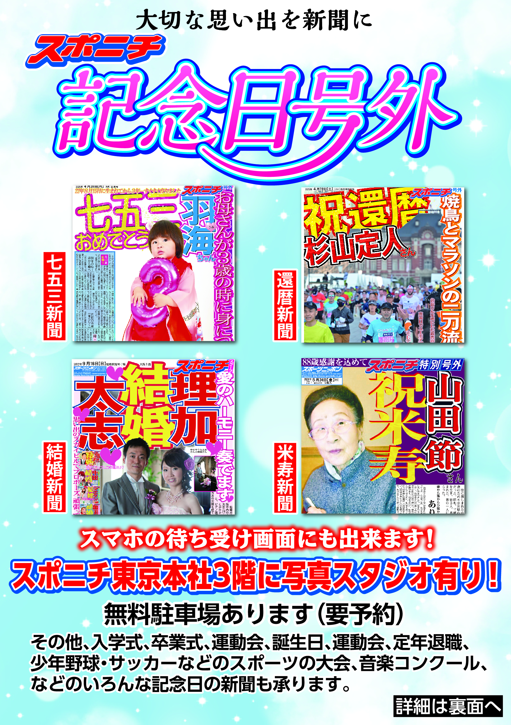 11月21日に阪神甲子園球場で行われる「第4回全日本大学準硬式野球東西対抗日本一決定戦甲子園大会」に参加の監督、選手、チームスタッフ、運営スタッフの皆さんに向けた「記念日号外」です。事前申し込みを基本とします。大会中に撮影した写真を閲覧用サイトにアップします。その中から紙面に使用する写真1枚をお選びいただき、あなただけのオリジナル新聞(カラー2ページ)を作成します。通常製作費税込み55,000円(本体価格50,000円+消費税)のところ、本大会限定特別価格税込み33,000円で製作します(30,000円+消費税。作成した紙面データURLをメールでお渡しします。印刷をご希望の方は別途税込み送料込み5,500円で50部を作成し送付します)。事前の申し込みがない場合でも写真閲覧サイトにご希望の写真があれば大会後の受付も可。