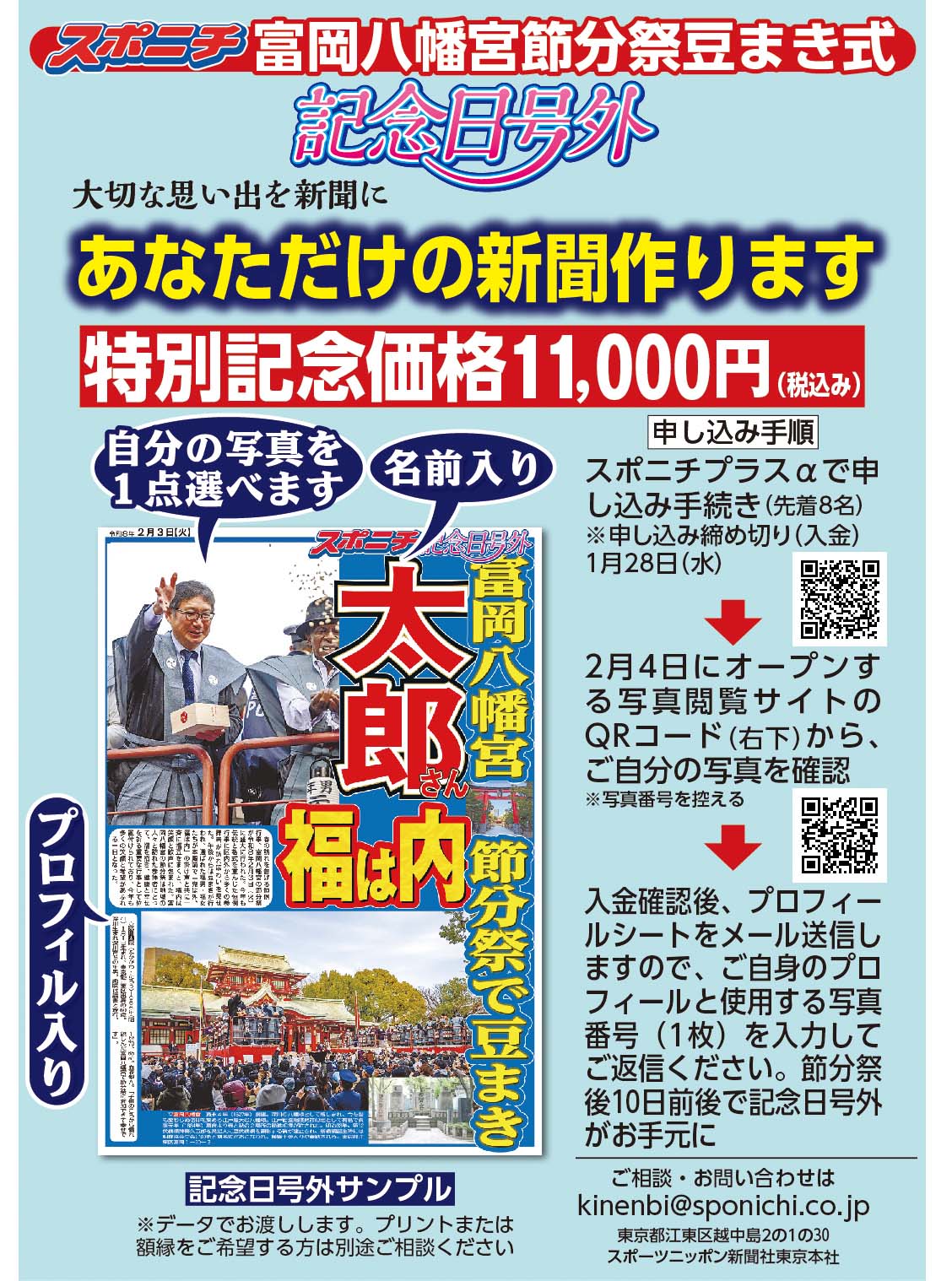 令和8年2月3日に江東区富岡の富岡八幡宮で行われる節分祭参加者のための記念日号外です。号外製作は先着8名様まで。事前にお申し込みいただいた方のお写真を節分祭当日に撮影し、号外に使用する写真(1枚。写真が閲覧できるサイトは2月4日公開予定)をお選びいただきます。さらにお名前の見出しを入れてスポニチのロゴ入りの号外(画像データ)を作成します。料金は税込11,000円。お申し込み期限は2026年1月28日。料金支払い期限も2026年1月28日です。料金支払後のキャンセルは不可となります。